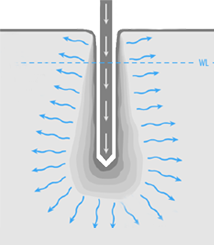 В этом случае используют забивные сваи, которые искусственно укрепляют околосвайный грунт. При погружении забивной сваи объем грунта, равный объему сваи, вытесняется вниз, вверх и в стороны, в результате чего грунт вокруг сваи уплотняется и создает значительное сопротивление боковой поверхности сваи с грунтом, что увеличивает несущую способность сваи. (см. фото ниже)